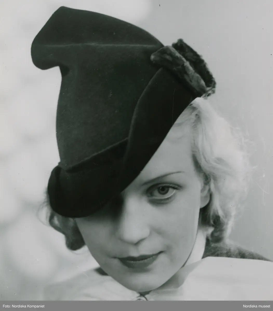 Modell i hatt, hög, mjuk kulle, mjukt brätte, nedragen över ena ögat.