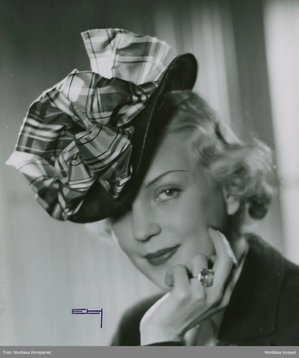 Modell i hatt som bärs ner över ena ögat. Kulle, svängt brätte, mycket stor rutig rosett i textil.