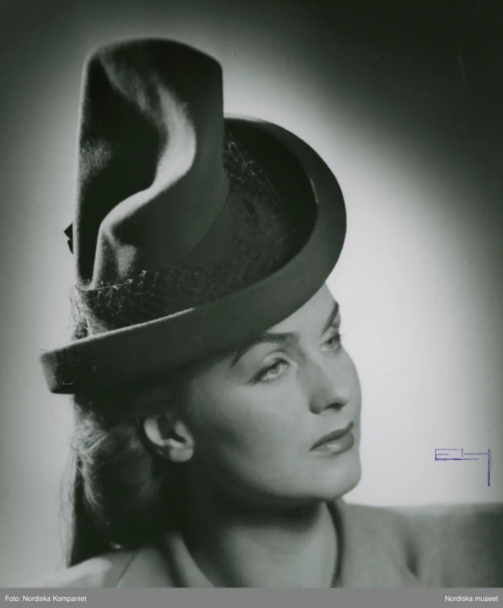 Modell i hatt från Rose Valois med hög, mjuk kulle, brätte med uppvikt kant. Hattband och flor runt kullen.