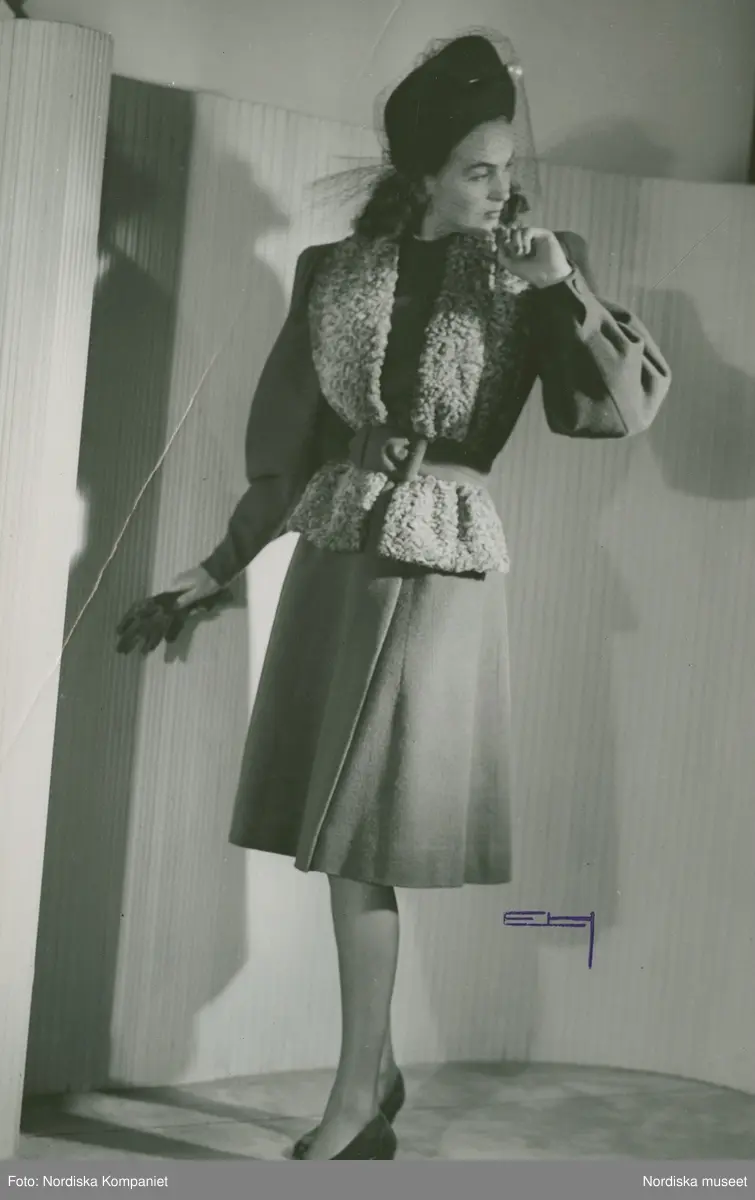 Modell i kappa med pälskrage, hatt med flor och pumps.