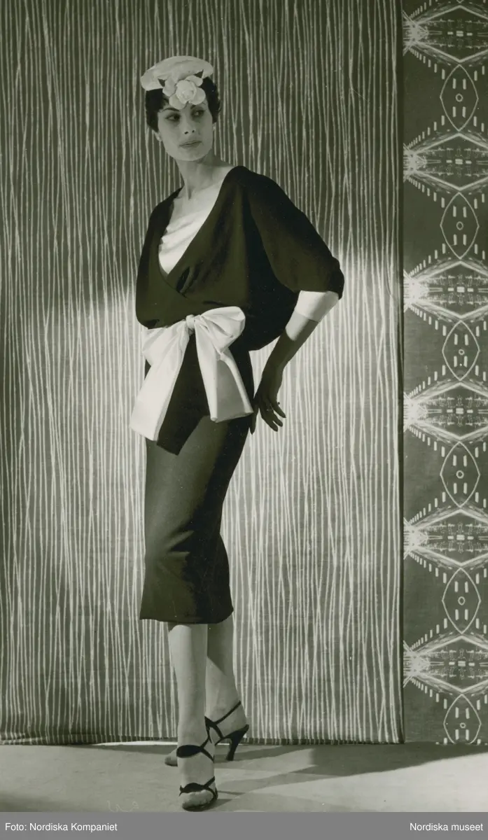 Modell i klänning med vit rosett, hatt med garnering. Från Balenciaga. Textilier i bakgrunden.