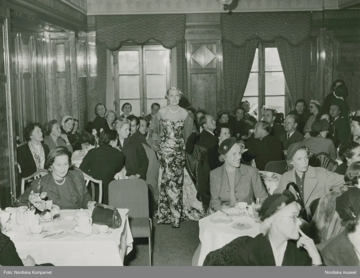 Modell i blommig aftonklänning, sjal och pärlhalsband på modevsining, Nordiska Kompaniet.