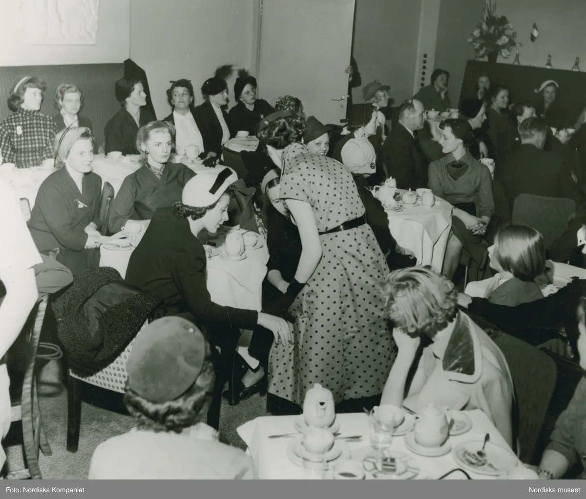 Modevisning på Nordiska Kompaniet, "Italiana". Modell i prickig klänning, hatt, handskar och skärp. Publik känner på klänningens kvalitet.