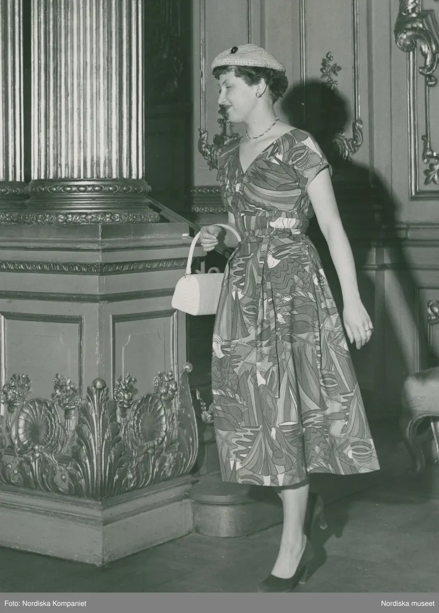 American Women Club. Modell i mönstrad klänning, hatt, handväska och pumps.
