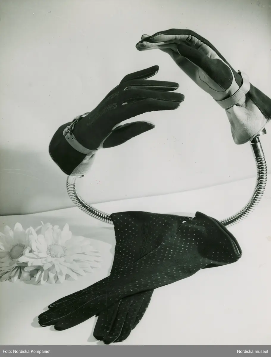 Kort helskuren kragmodell i dubbelfärgad suède och glacé med sleif vid handleden. Perforerad suèdehandske. Vita pikéblommor.