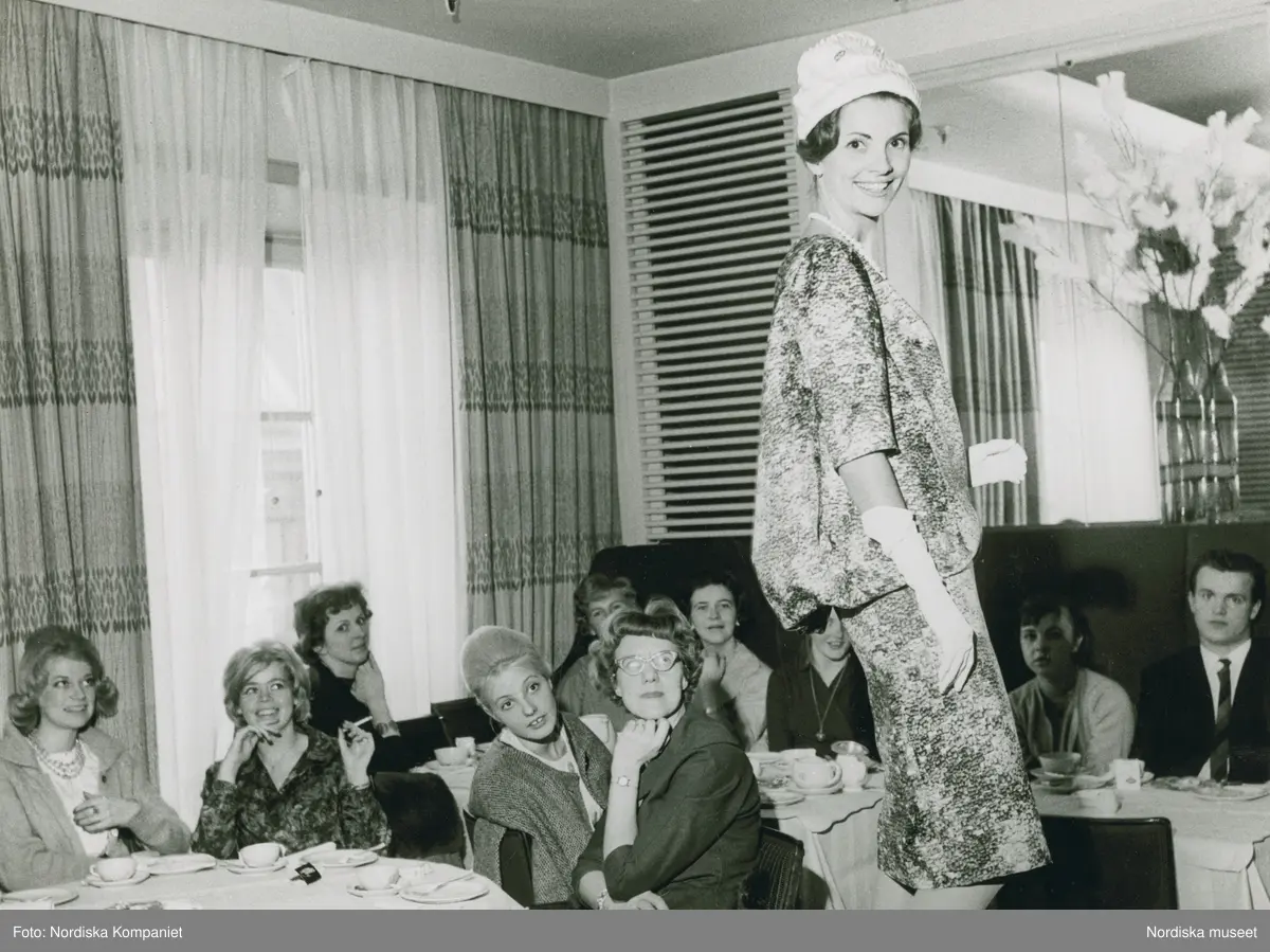Modell i mönstrad jacka och kjol, hatt, halsband och handskar. Publik vid bord.