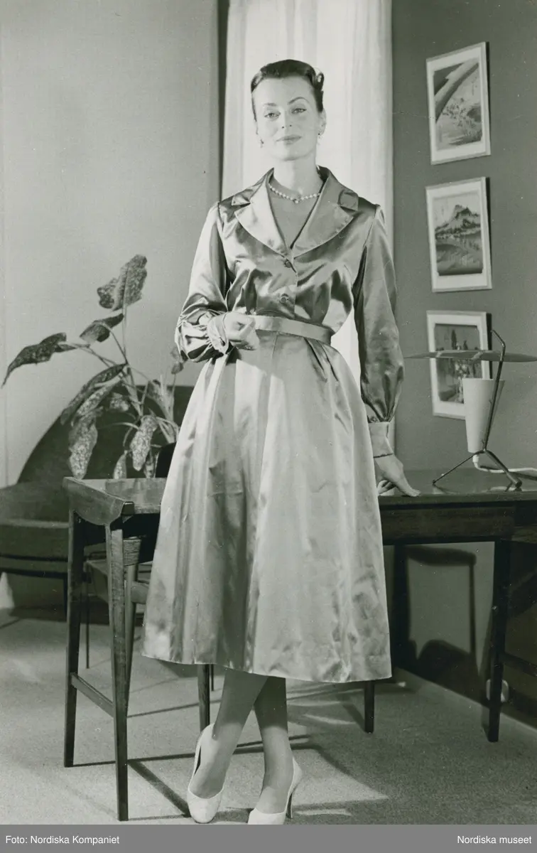 Mönster NK-Stil. Modell i blus och kjol, halsband och pumps, vid ett bord. Blusen - mönster C. Kjolen - mönster D.