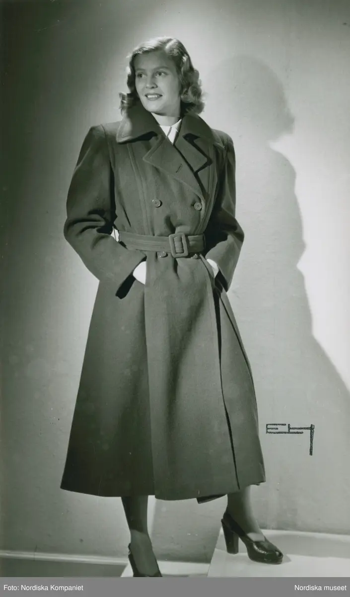 Modell i kappa och högklackade skor med öppen tå, på en trappa.