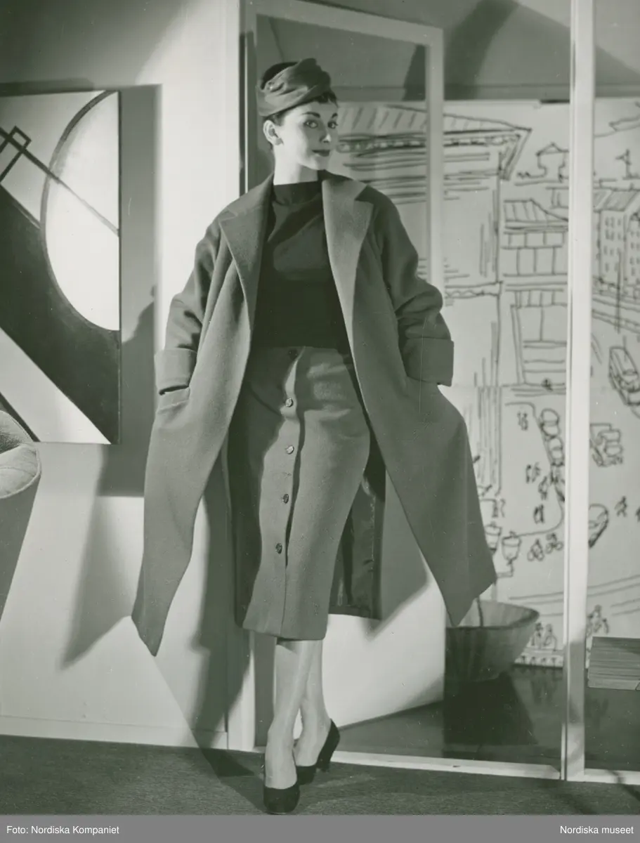 Modell i mörk tröja, kjol, kappa och hatt, framför en dörr. Konstverk på väggen. Modellbutiken.