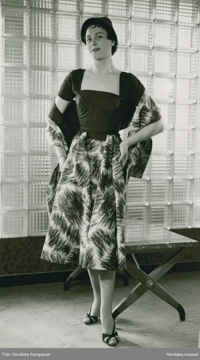 Modell i mörk överdel och mönstrad kjol och sjal i samma mönster, framför betongglas, vid ett bord. Modellbutiken.