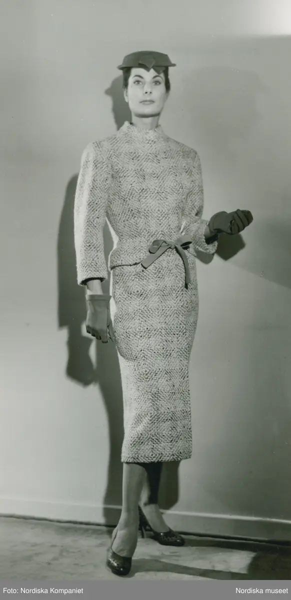 Modell i klänning med rosett, hatt, handskar och pumps. Original från Balenciaga.