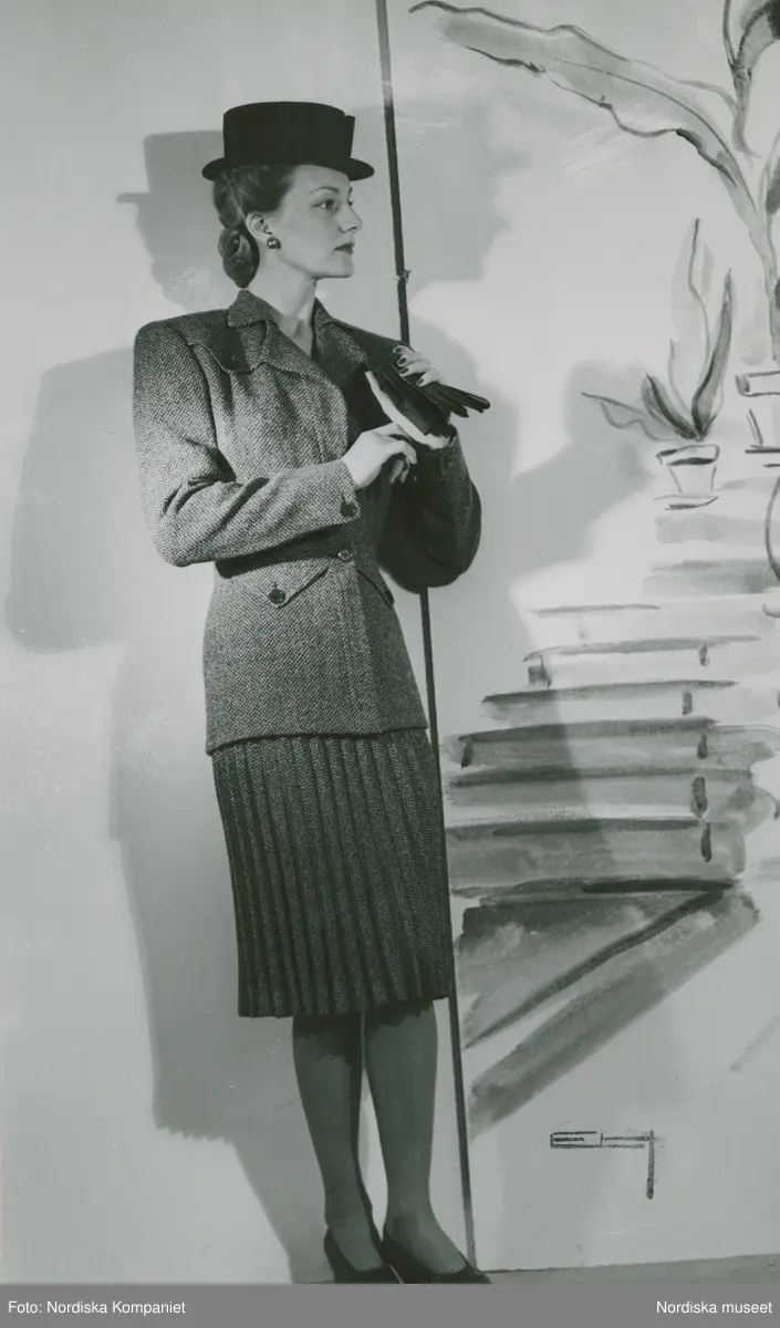 Modell i dräkt med plisserad kjol, hatt, håret i chinjong, örhängen, handskar i handen och pumps, står framför en väggmålning. Från Edward Molyneux.