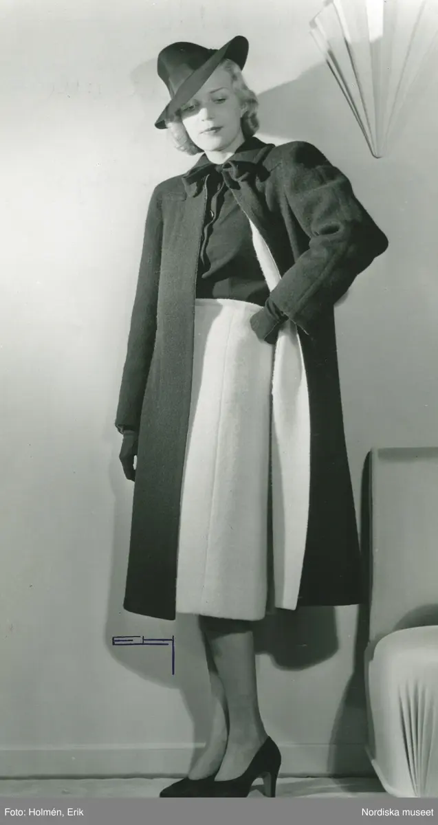 Helporträtt av modell. Resekappa i svart ylle med vit insida, blus i svart jersey, vit kjol, samt hatt och pumps.