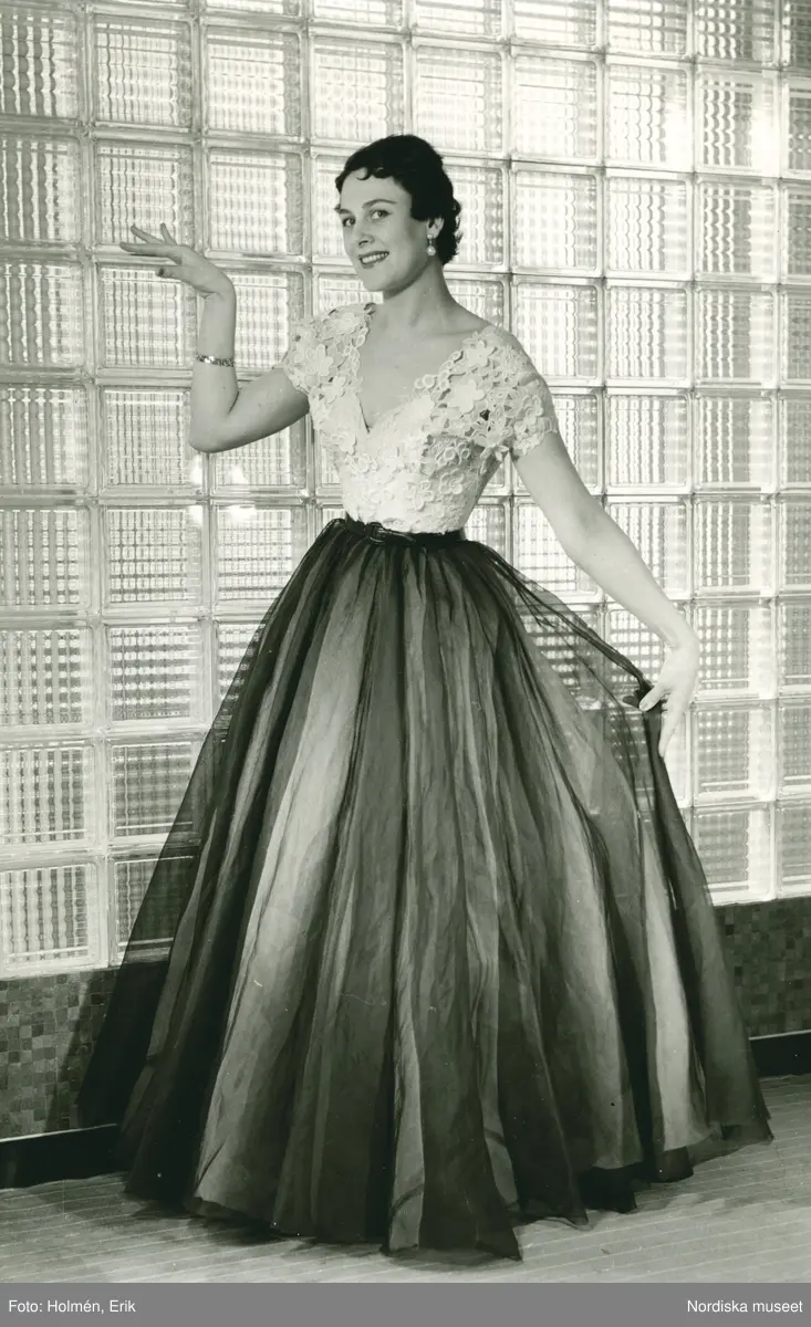 EM, Modellbutiken, Nordiska Kompaniet, Damkonfektion. Modell i aftonklädsel. Överdel i vit spets med blomstermotiv och vid kjol med yttre lager av mörk tyll, samt örhängen och armband.