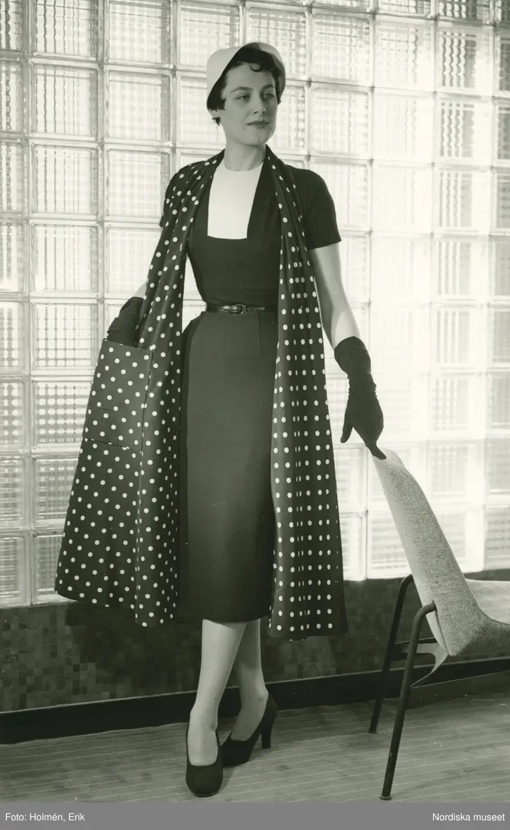 EM, Modellbutiken, Nordiska Kompaniet, Damkonfektion. Modell i mörk klänning, lång sjal med prickar och ficka, hatt, handskar och pumps, lutar sig mot stol. Betongglas i bakgrunden.