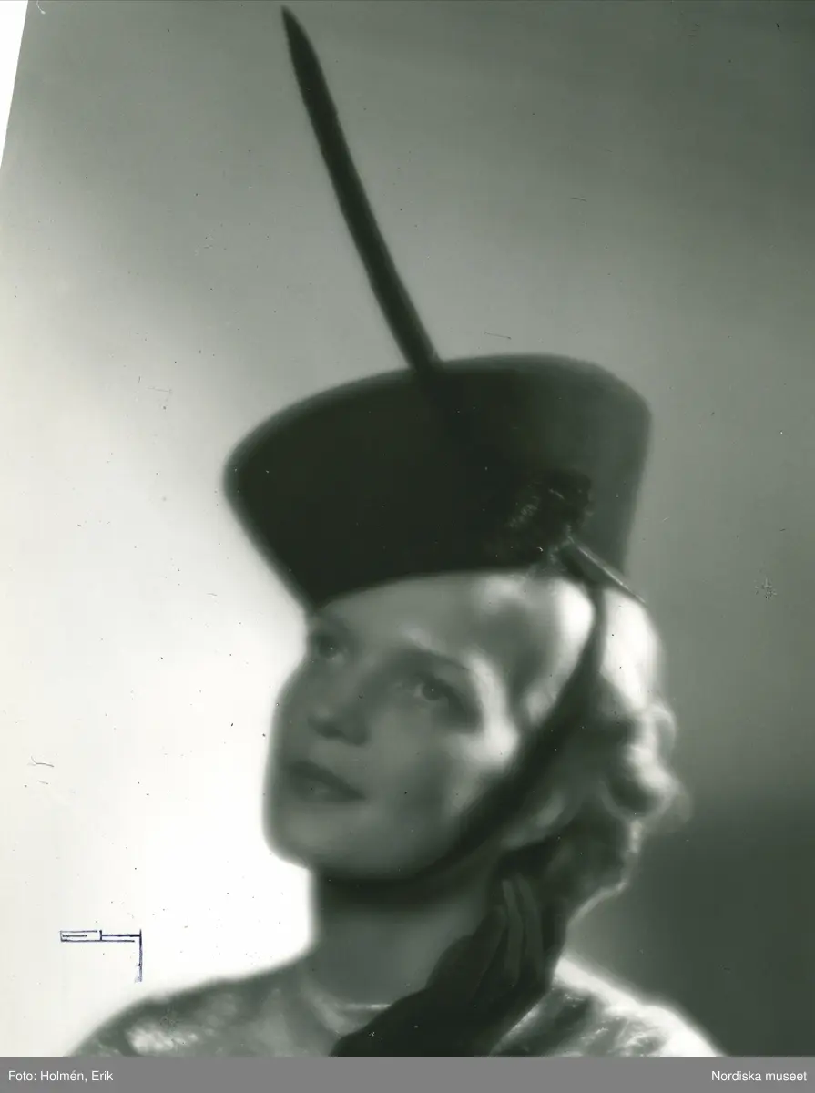 Fb, Porträtt av kvinna med hatt i svart filt med hakband.