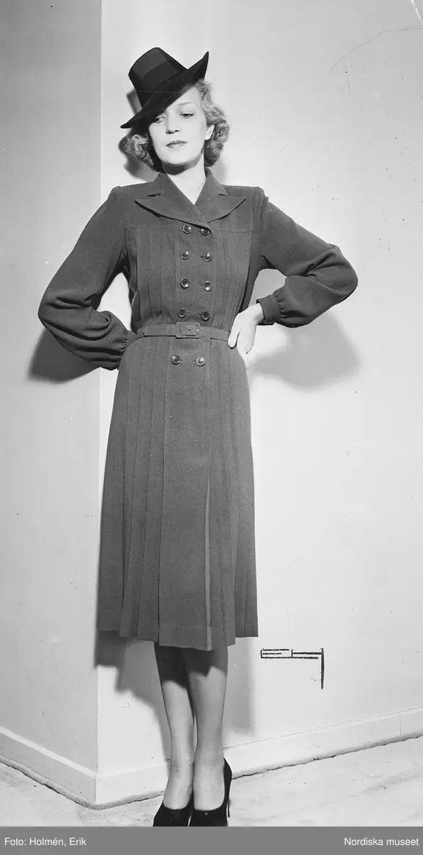Modell i dubbelknäppt klänning, hatt och pumps.