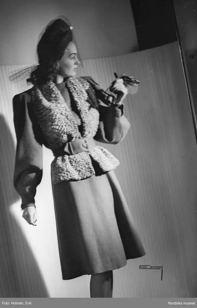 Modell i klänning med päls och skärp, hatt med flor och handskar i handen. Från NK:s Franska.