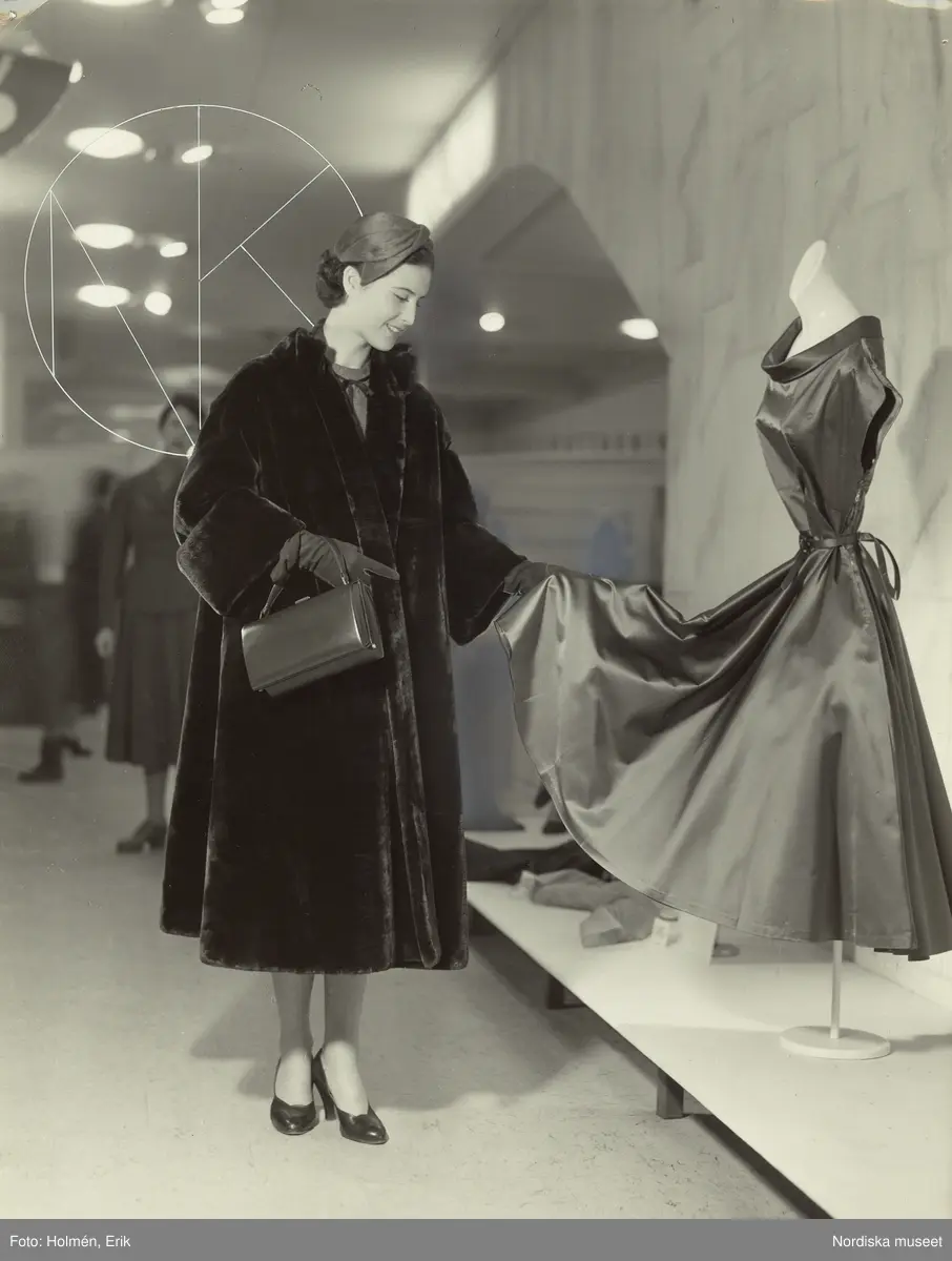 Nordiska Kompaniet. Kvinna i mörk päls betraktar en sidenklänning på NK.