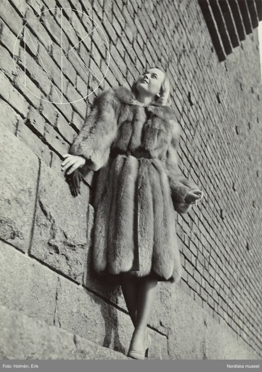 Nordiska Kompaniet. Kvinna i ljus päls med skärp. Bakom henne en husvägg av tegel.