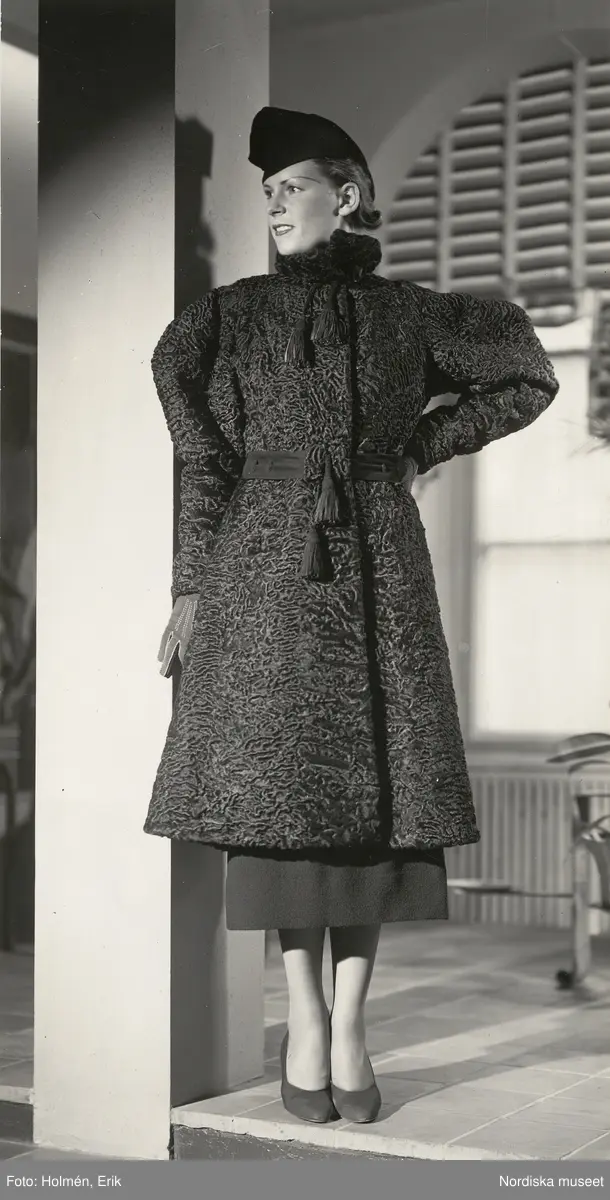 Kvinna i persianpäls med fårbogsärmar. Skärp med tofsar. Text på baksidan: "Vionnet" [Madeleine Vionnet].
