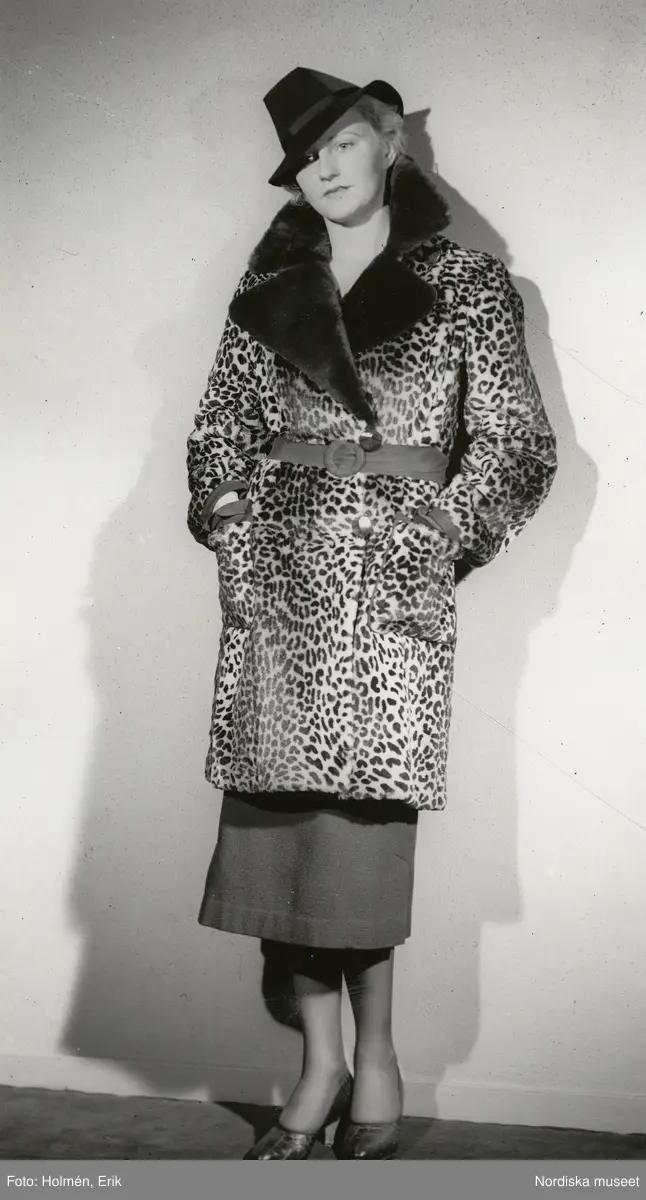 Nordiska Kompaniet. Kvinna i leopardpäls med svart krage och ljusare skärp. Svart hatt.