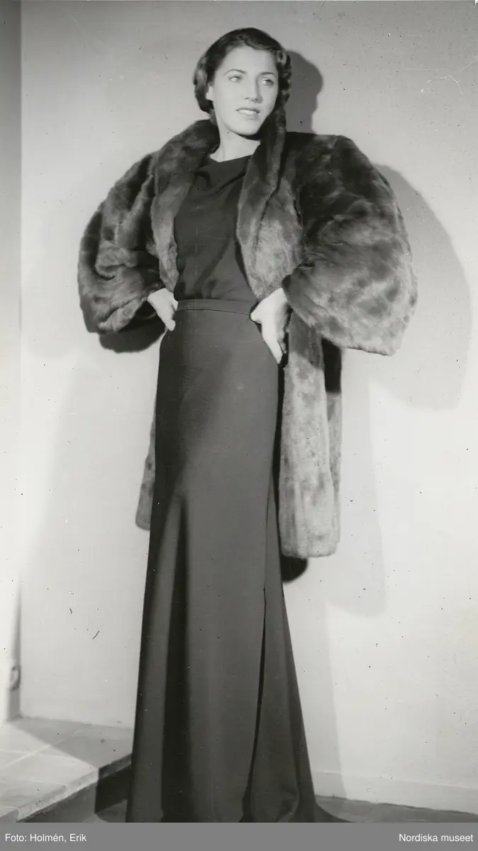 Nordiska Kompaniet. Kvinna i mörk aftonklänning och pälsjacka.