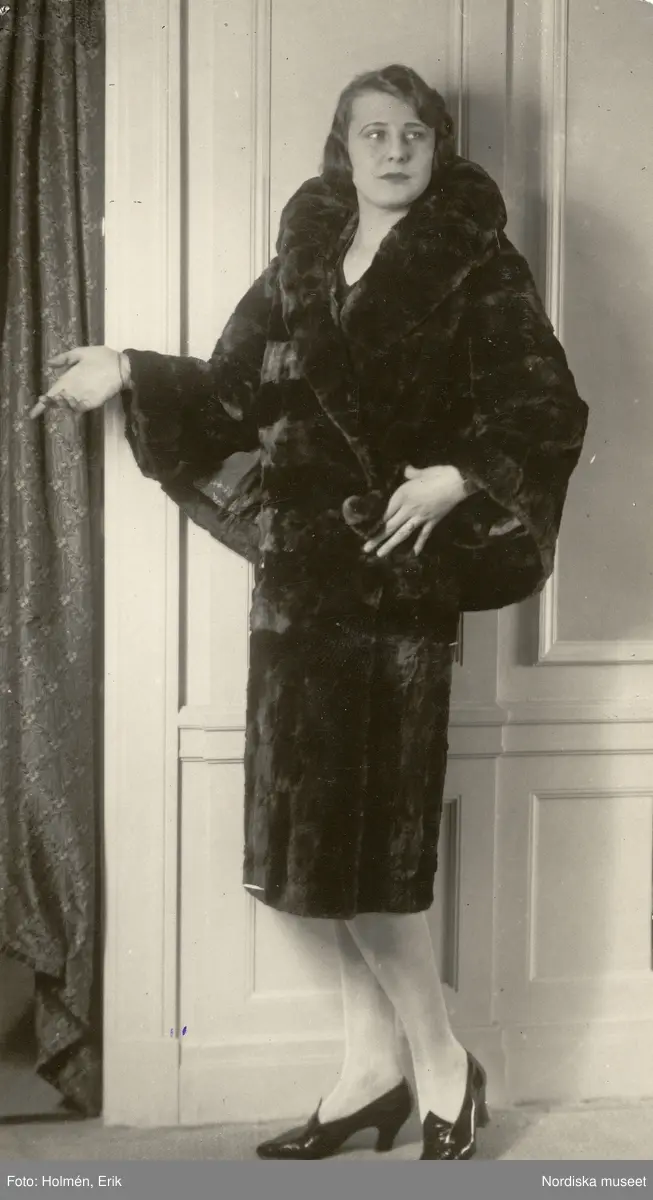 Nordiska Kompaniet. Kvinna i mörk pälskappa med vida ärmar och bred krage.