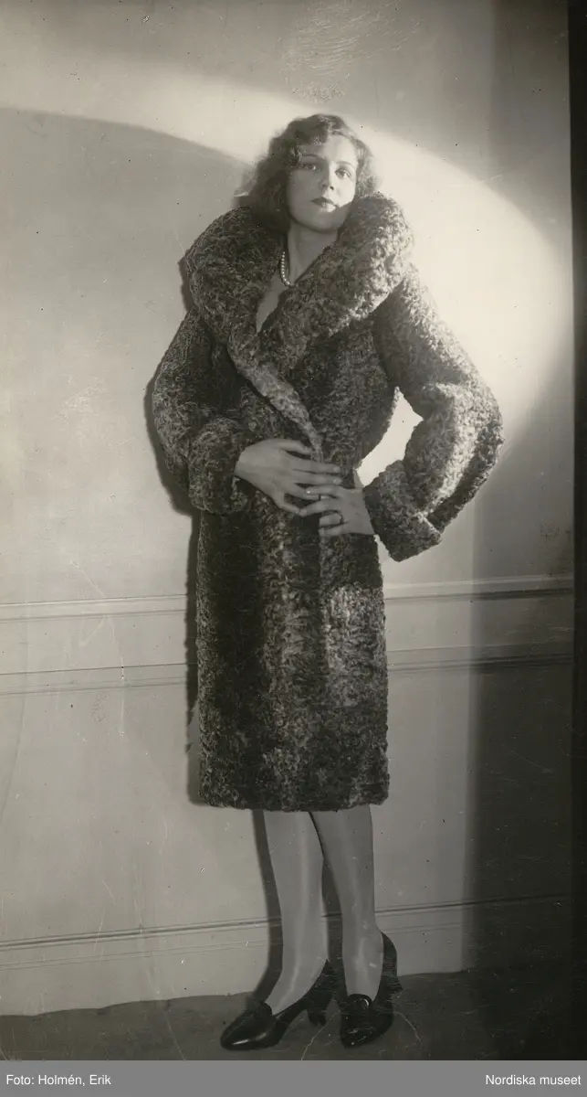 Nordiska Kompaniet. Kvinna i mörkgrå persianpäls med bred krage. Text på baksidan: "Mörkgrå persian. Pälsar år 1929."