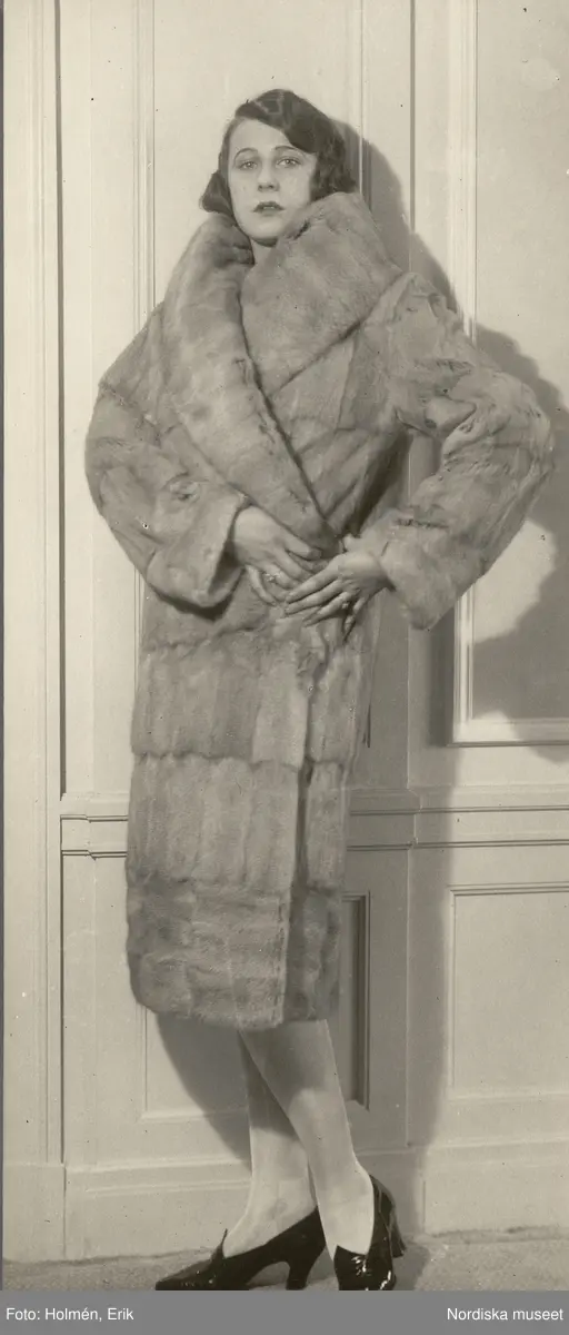 Nordiska Kompaniet. Kvinna i ljus päls med bred och hög krage. Text på baksidan: "Pälsar och pälsverk år 1926".