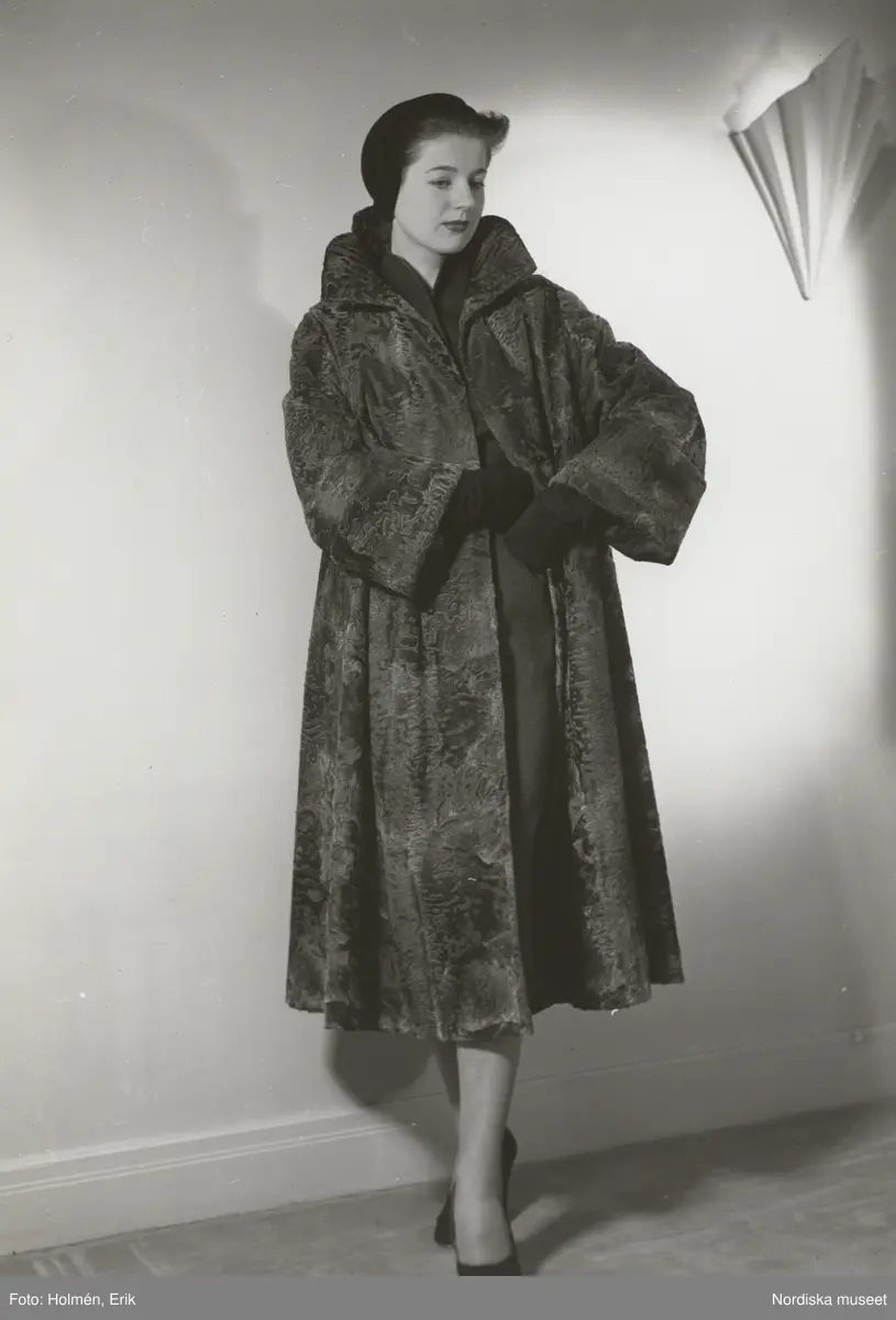 Nordiska Kompaniet. Kvinna i mörk päls med vida ärmar och hög krage. Text på baksidan: "1952"