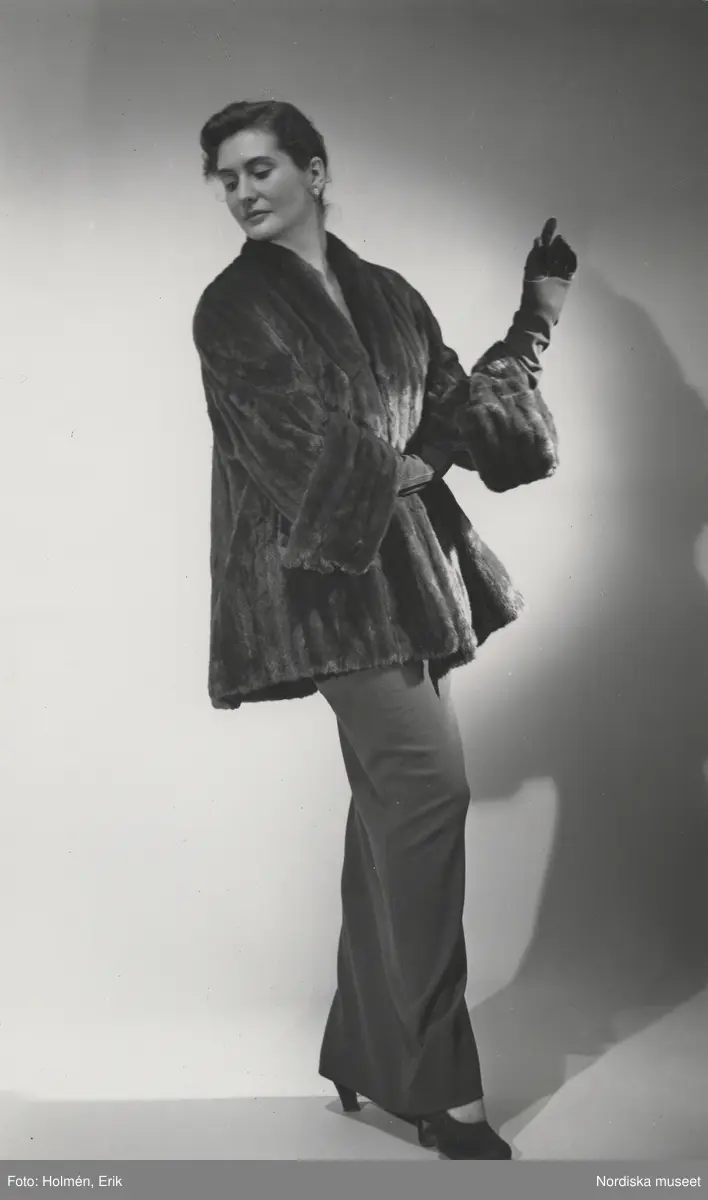 Nordiska Kompaniet. Kvinna i mörk pälsjacka och mörk, lång klänning. Text på baksidan: "Horowitz f. rysk hermelin 1951"