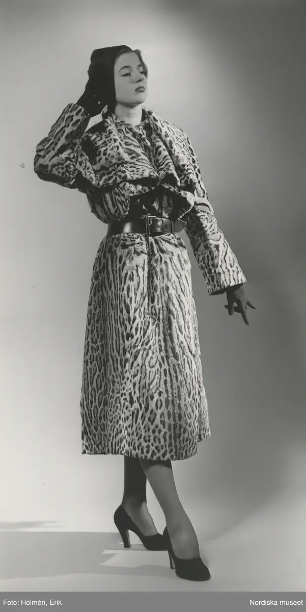 Nordiska Kompaniet. Kvinna i ozelotpäls. Text på baksidan:"NK. ozelot 1951"