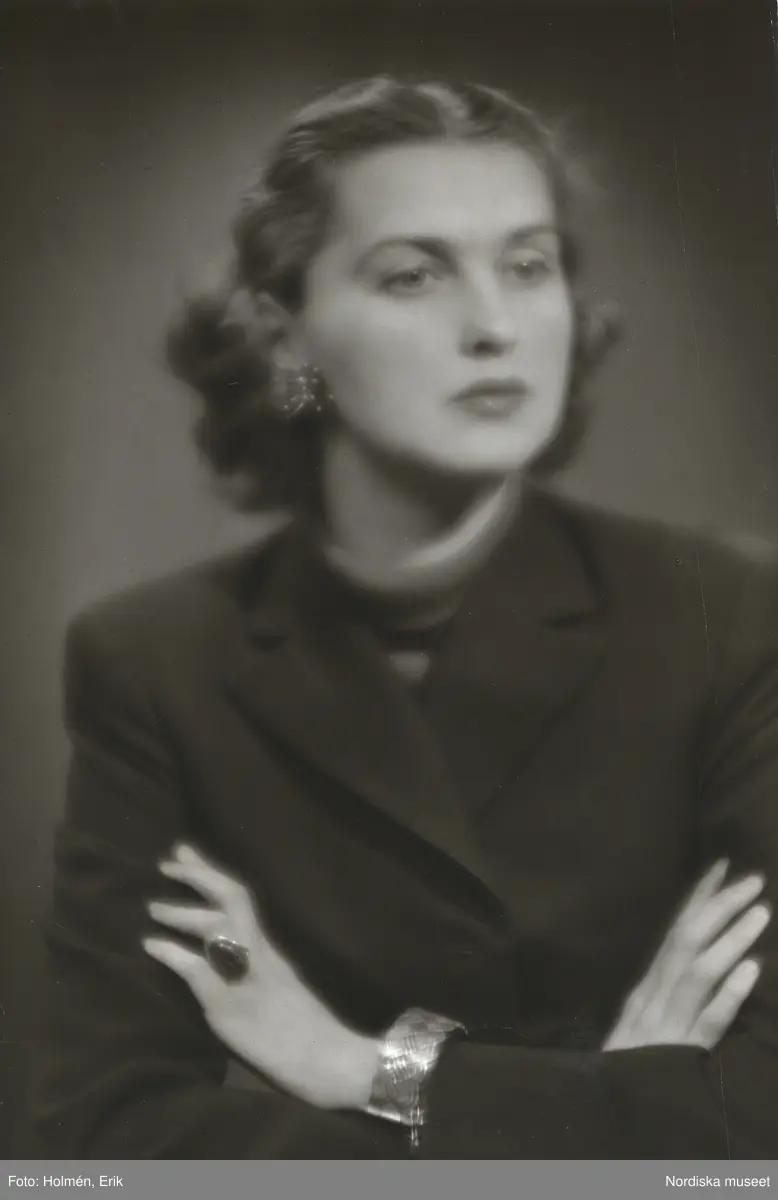 Nordiska Kompaniet. Porträtt av modell i mörk dräktjacka och polotröja. Text på baksidan: "mars 1950".