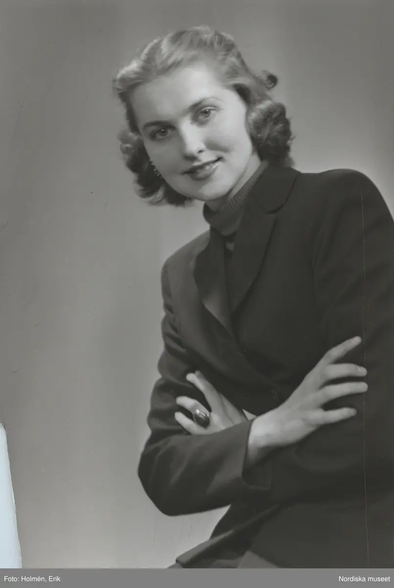 Nordiska Kompaniet. Porträtt av modell i mörk dräktjacka och polotröja. Text på baksidan: "mars 1950".