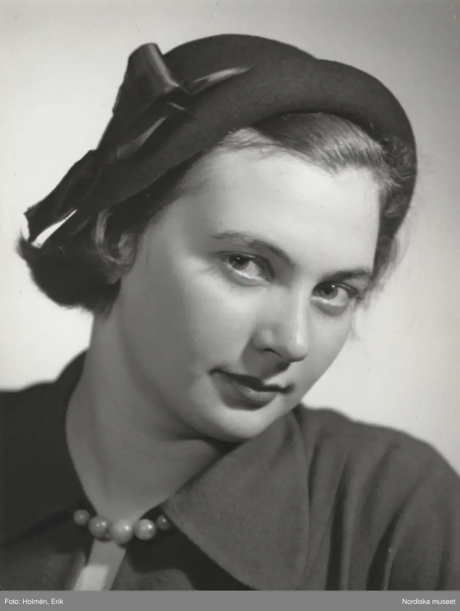 Nordiska Kompaniet. Porträtt av modell i mörk hatt med blankt band. Text på baksidan: "mars 1950".