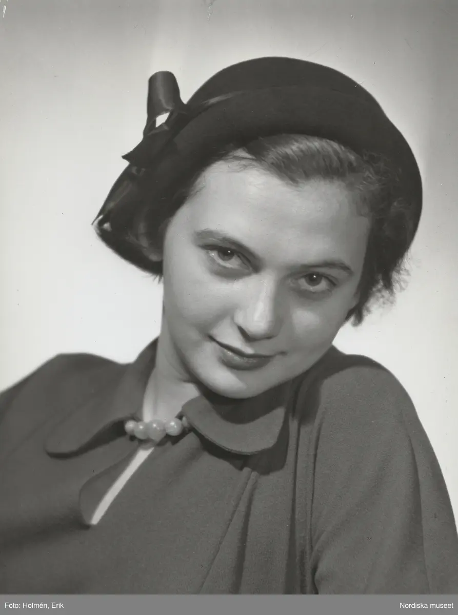 Nordiska Kompaniet. Porträtt av modell i mörk hatt med blankt band. Text på baksidan: "mars 1950".