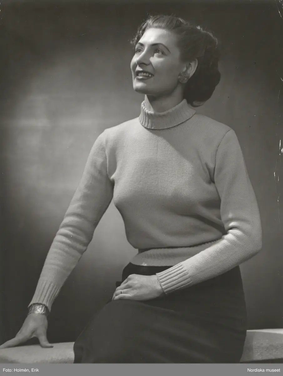 Nordiska Kompaniet. Kvinna i ljus polotröja och mörk kjol. Text på baksidan: "mars 1950 Sara Olsson"