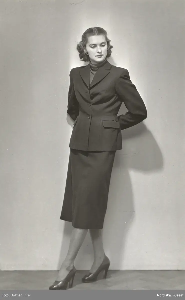 Nordiska Kompaniet. Kvinna i mörk dräkt och polokrage. Text på baksidan: "Mars 1950"