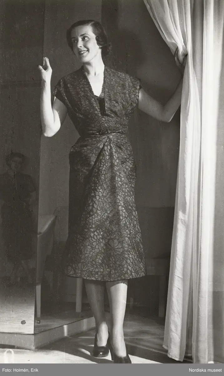 Nordiska Kompaniet. Kvinna i mörk, mönstrad klänning. Text på baksidan: "mars 1950"