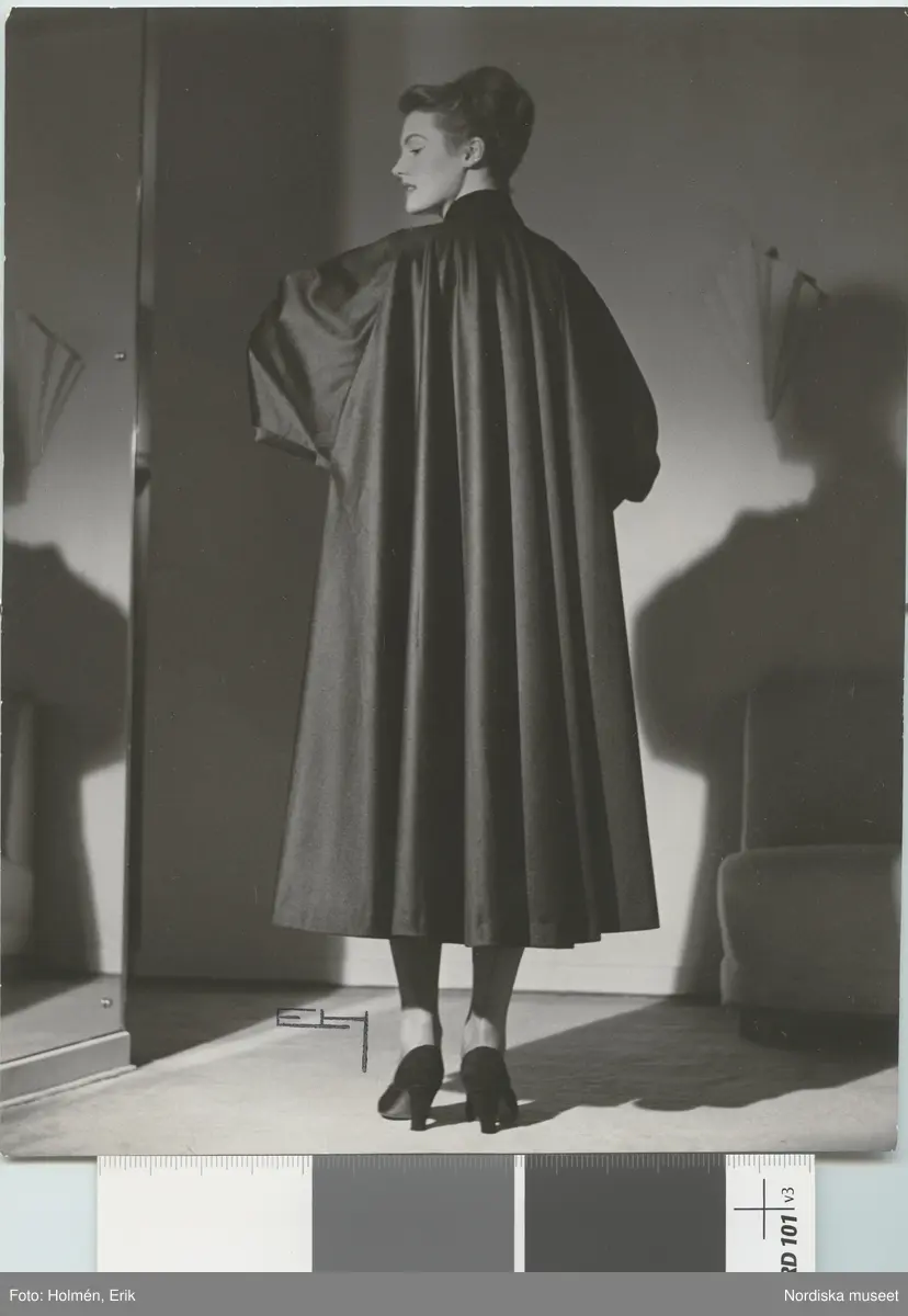 Nordiska Kompaniet. Kvinna i vadlång, mörk kappa med mjuka veck i ryggen samt vida ärmar.