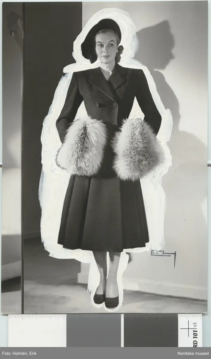 Nordiska Kompaniet. Kvinna i mörk kappa med stora pälsbesättningar vid ärmsluten.