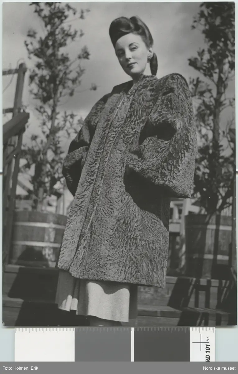 Nordiska Kompaniet. Kvinna i brun amerikansk Breiitschwantzpäls med vida ärmar och breda axlar.
