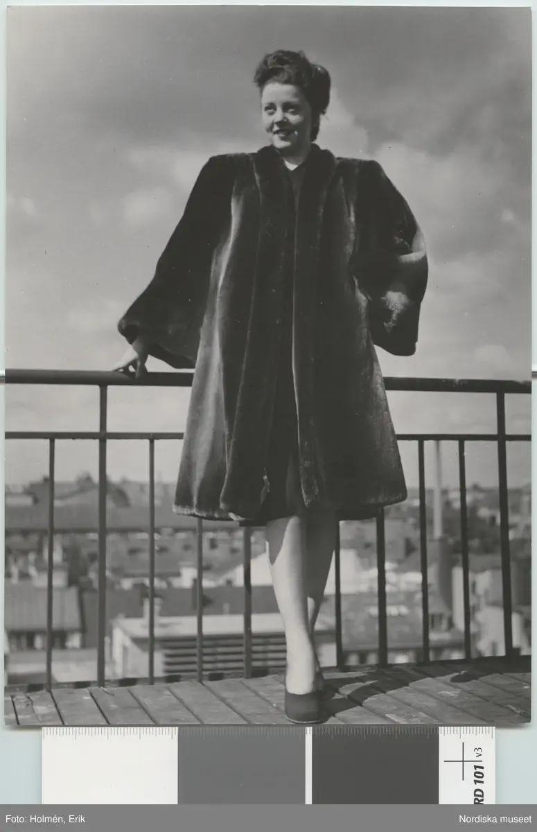 Nordiska Kompaniet. Kvinna glansig bäverpäls. Text på baksidan: "Amerikansk päls maj 1946. Bäver. Nytt och nyttigt. Pälselegans."