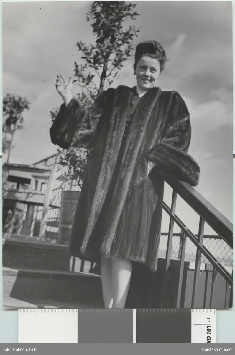 Nordiska Kompaniet. Kvinna i minkpäls. Text på baksidan: "Amerikansk päls maj 1946."