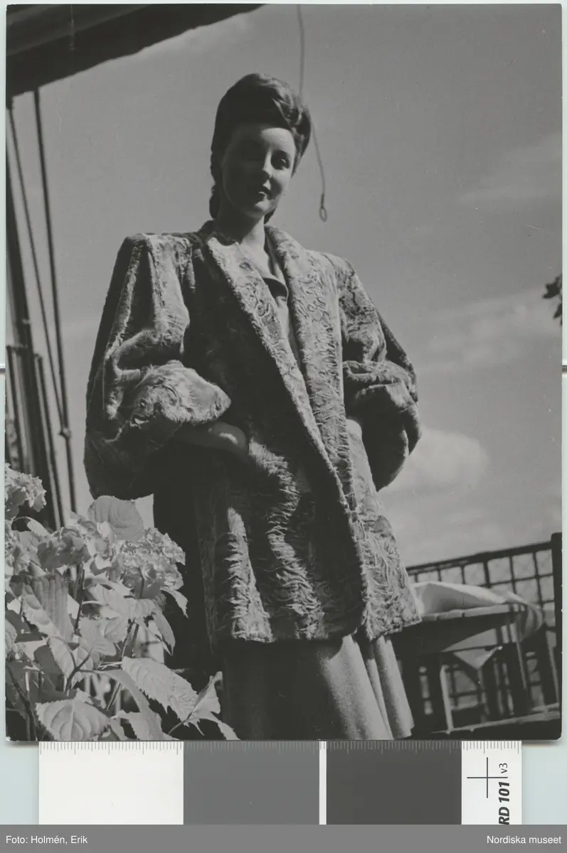 Nordiska Kompaniet. Kvinna i ljus pälsjacka med vida ärmar. Text på baksidan: "Am.[erikanska] pälsar 1946. Peilikuva [?]"