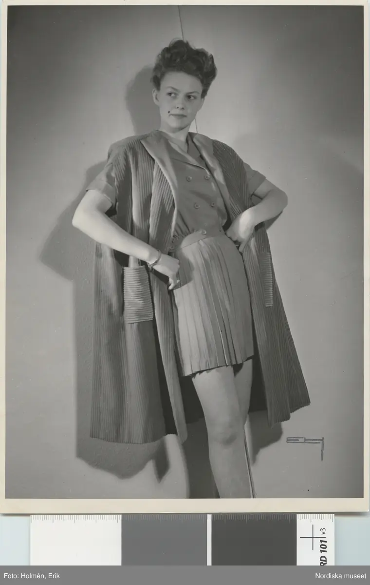 Nordiska Kompaniet. Kvinna i lårkort plisserad klänning. Över bär hon en vid, ärmlös cape av sniljeflossa. Text på baksidan: "Molyneux våren 1947"