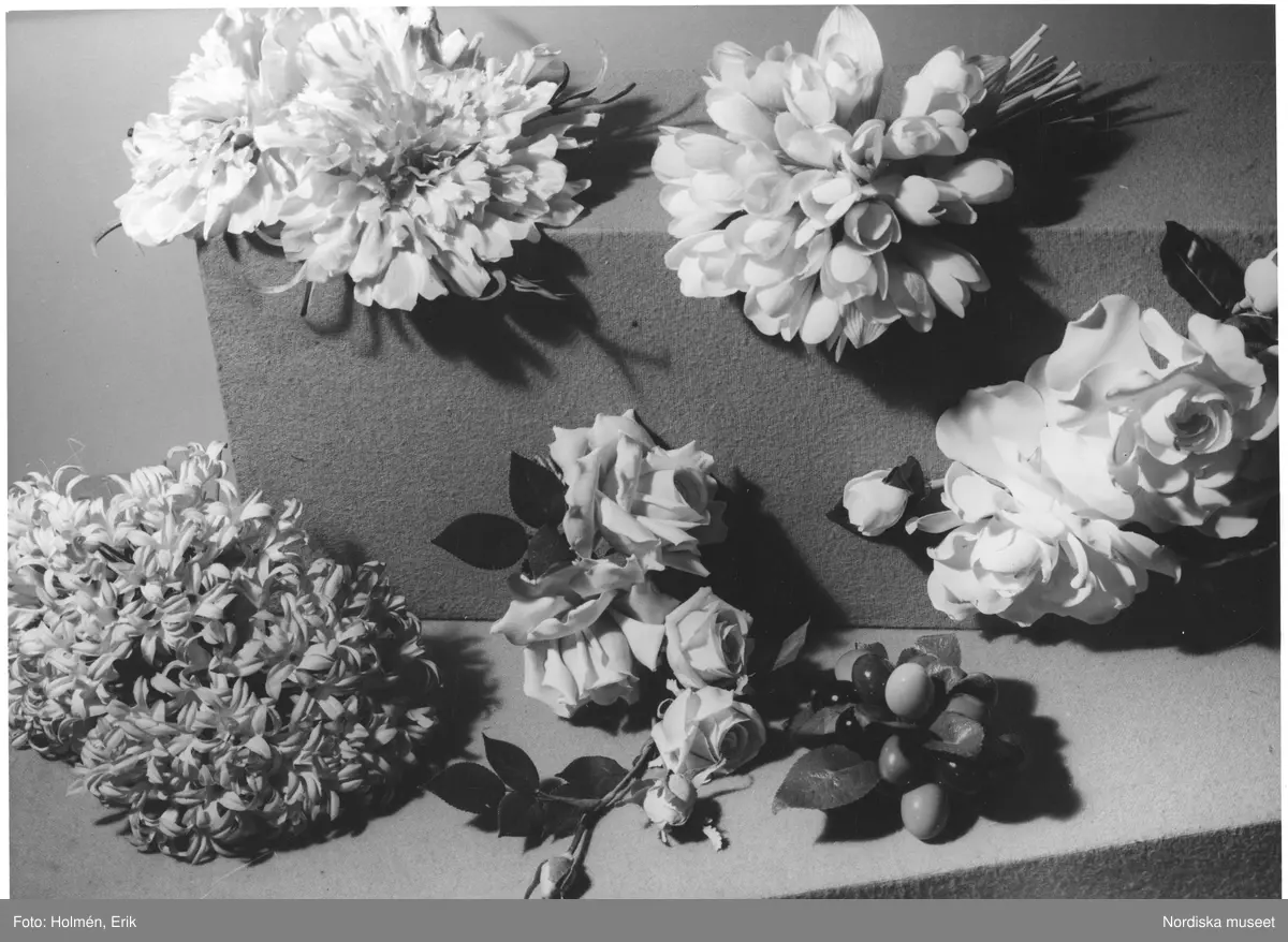 Kollage av accessoarer. Blommor. "De moderna blommorna för våren. Nejlikor i siden, krokus i buketter, hyacinter och bär. För både hattar och klänningar."