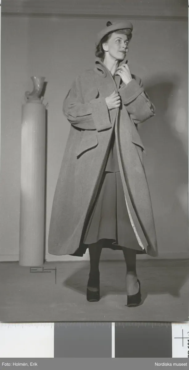 Nordiska Kompaniet. Kvinna i vid kappa. Text på baksidan: "Madelaine de Rauch"