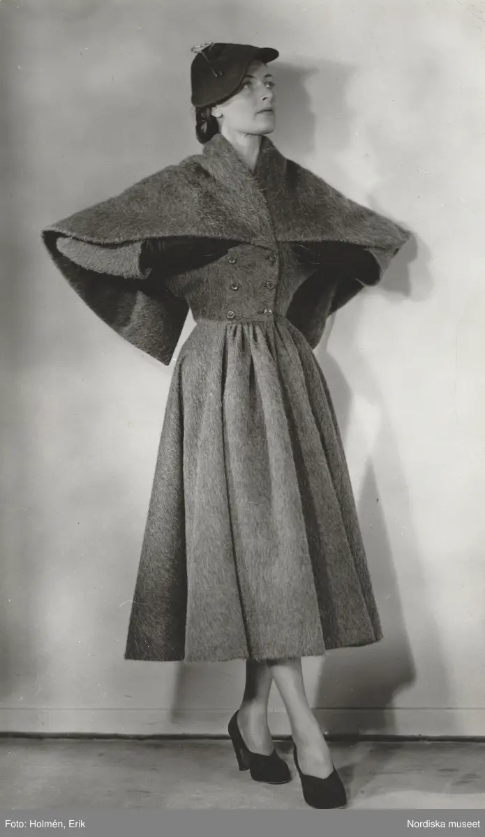 Modell i mörkgrå pälskappa med sjal, samt hatt och handskar. Madame Grès.